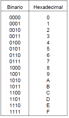 Tal y como se explican en la tabla, se muestra la equivalente de un número hexadecimal en número binario, siendo en binario un dígito de 4 cifras de 0 y 1.