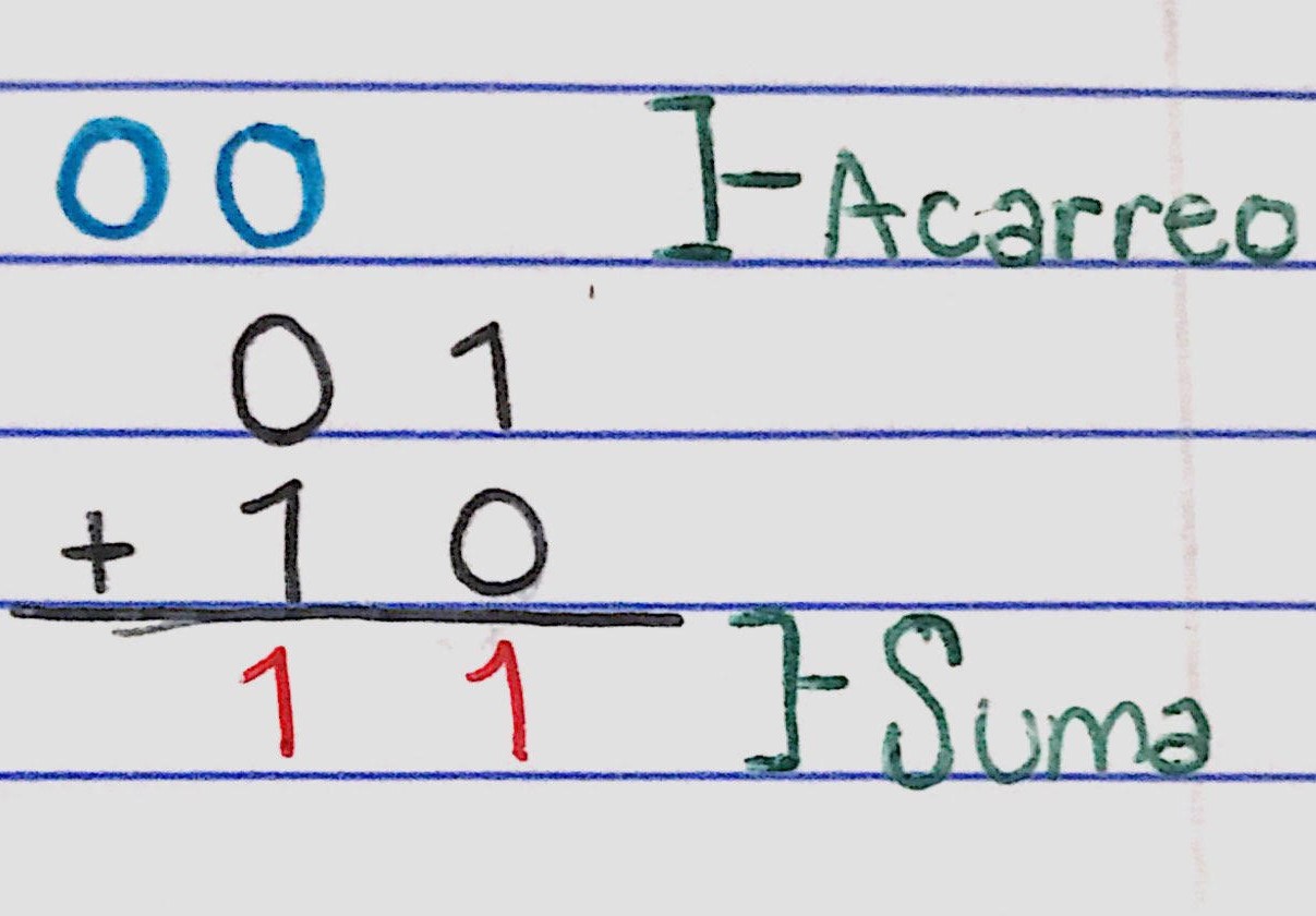 En la última regla 4 podemos ver que hay un 1 y un 0, esto no es un 10 sino ambos números separados, siendo el 1 el acarreo y el 0 la suma. El acarreo es «llevarse una» cuando realizas una suma, tanto en el sistema binario como en cualquier otro. Vas sumando uno al dígito de la derecha y cunado llegues a máximo dígito que permite la base elegida, tienes que«ponerlo a cero» y sumarle uno al dígito que está a su izquierda.